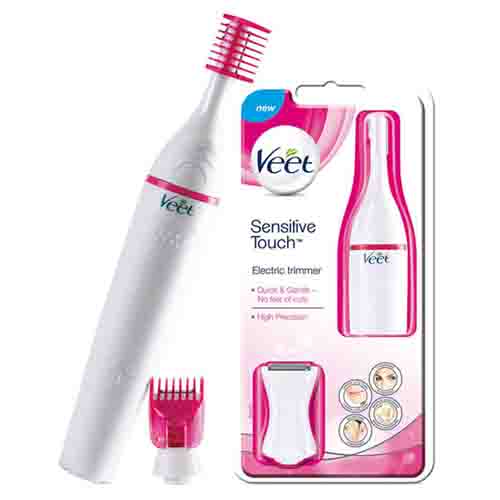 The first Veet beauty styler specially tailored for sensitive body parts such as upper lip, side burns and eyebrows. Precise and easy to handle, it removes hair gently while its cutting blade has no direct contact with the skin, so no fear of cuts. And as it is compact and elegant, you can put it in your handbag for quick touch-ups, anywhere, anytime. For perfect looking eyebrows, step 1 is trim. For desired eyebrow length just trim them. Use the small head and add the comb. Place the device over your eyebrow and move it against the direction of hair growth. For perfect looking eyebrows, step 2 is shape. For a perfect eyebrow contouring, remove the comb and use the high precision head. Touch skin lightly and push it across the eyebrow. For gently shaved or shaped bikini use the larger head. Touch skin lightly and move the device to the opposite direction of hair growth. For gently shaved or shaped bikini For trimming, add the comb and choose the desired length.